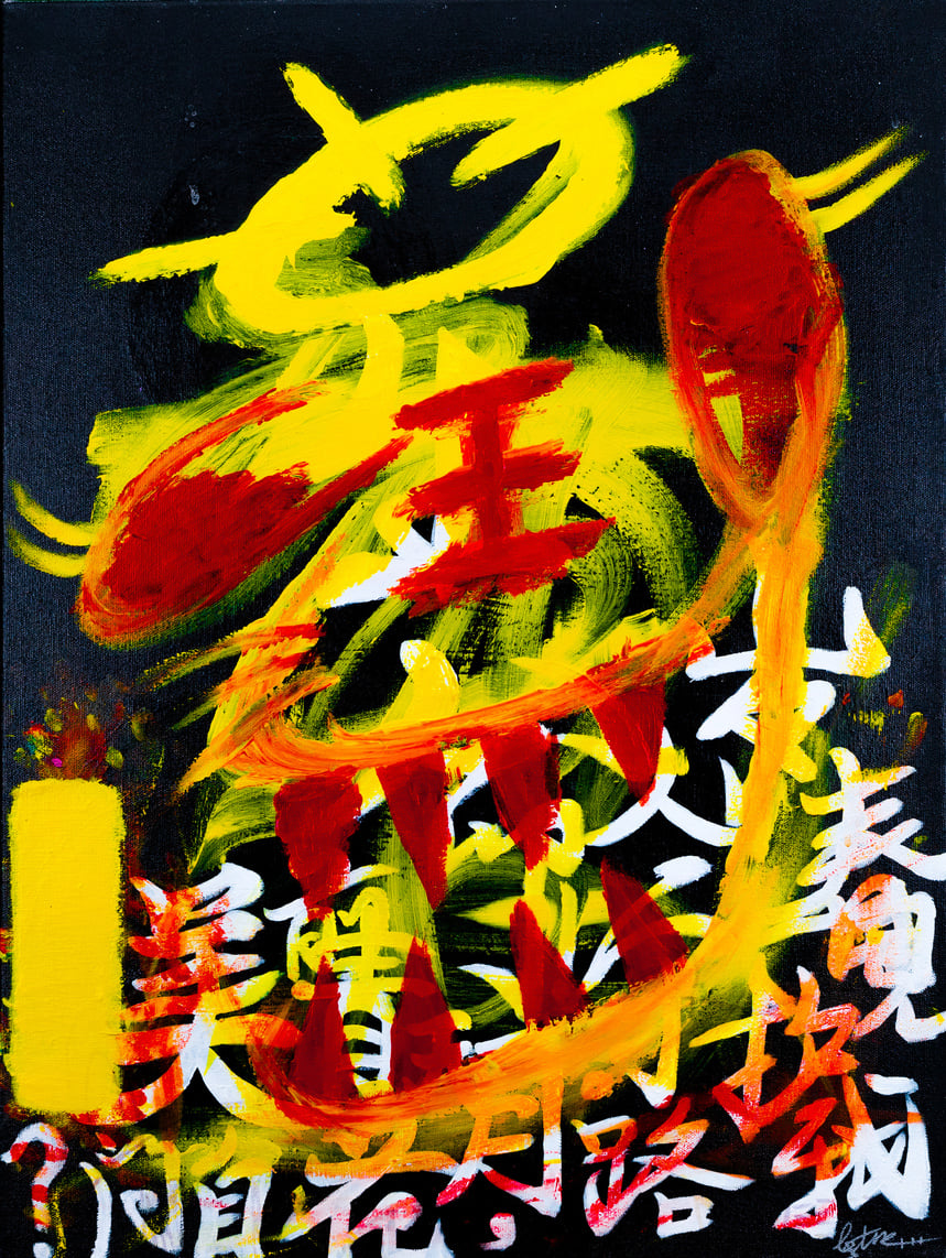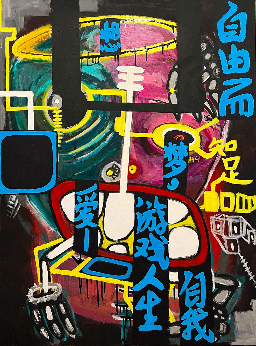 This painting encapsulates my burning desire to chase after my dream. The Chinese characters etched across the canvas are imbued with the essence of what achieving that dream represents -- freedom. A fervent yearning drives me to push my limits, to transform this longing into tangible reality. I'm ready to dedicate myself unconditionally, no matter the obstacles that lie ahead.